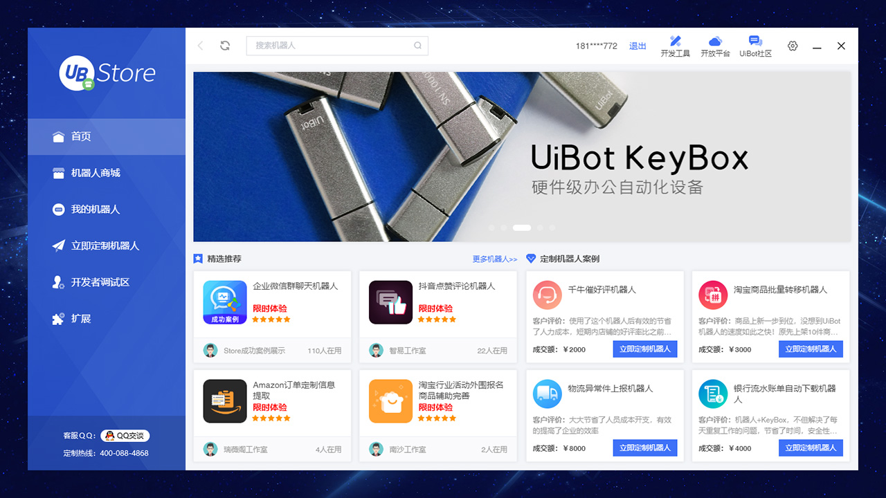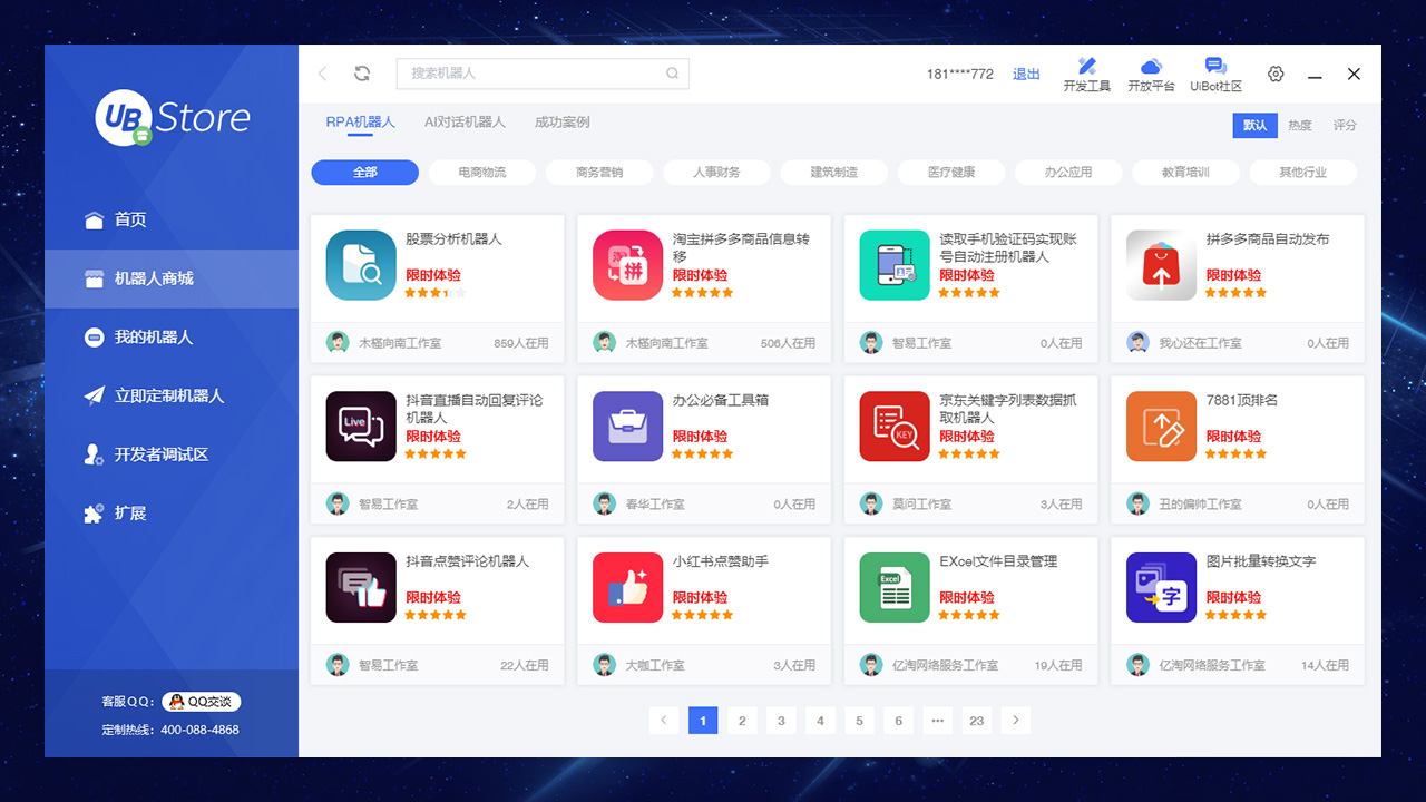 作为当前国内*大的RPA+AI SaaS交易平台,UB Store“机器人商城”精品机器人的数量已达到300+,覆盖财税、金融、物流、零售、电商、制造、人资、信息技术等十多个行业领域及门类,产品与服务均处于行业领头地位。
